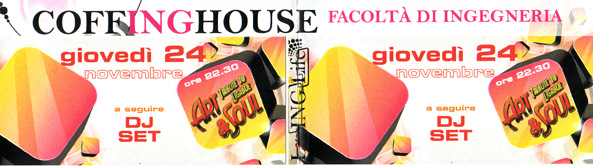 "Ph. Gregorio Moscato" (Web. Occhibelli Alberto Creazione Gallery in Work) 17/11/2011 - Coffing House & FACOLTA' DI INGEGNERIA Prossimo Evento University Night Coffing House & FACOLTA' DI INGEGNERIA presenta...17/11/2011 Dopo una grande apertura d'anno ...continua la stagione invernale delle feste universitarie reggine! Il GIOVEDì di ingegneria!