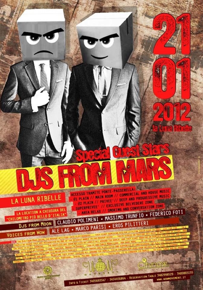 BIOGRAFIA: The Djs From Mars bring the mashup attitude into electrohouse…they start remixing big pop hits for their gigs in 2004, just for fun…In a couple of years they are recognized as one of the biggest names in the mashup scene…their videos on Youtube get over 10 millions of views, and the hype is still growing…