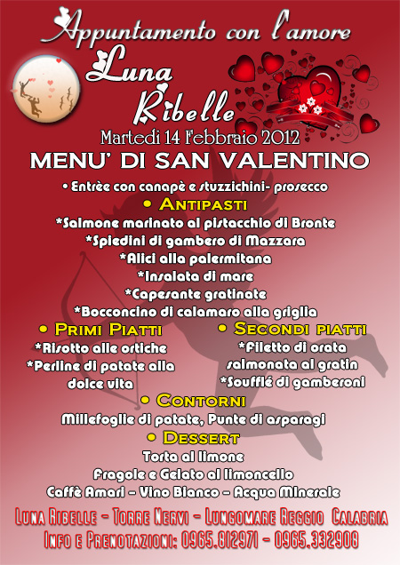 *AVVISO* Ringraziamo tutti coloro che hanno partecipato alla bellissima serata e ricordiamo a tutte le coppie e persone, Che possono richiedere il file originale delle foto stampate, inviando una **RICHIESTA** o Invia Email a info@lovephoto.it Il servizio stampa è stato ommaggiato dal Locale Luna Ribelle - Reggio Calabria ------------------------------------ 14/02/2012 Torre Nervi - Terrazza Lido Comunale Reggio Calabria Info: Telefono: 0965.812971 / 0965.332908 Cena Romantica & Live dei Romantici Tribute Modà MENU’ DI SAN VALENTINO • Entrèe con canapè e stuzzichini- prosecco
