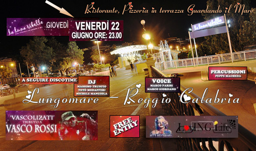 THE NEW EXPERIENCE LovingLife&Notte Mediterranea @ il giovedì reggino non si ferma ma CONTINUA con la stessa formula LIVE&DISCO nella splendida Luna Ribelle! 22 Giugno ore 23:00 ****** LIVE BAND ****** ► Vascolizzati*VASCO ROSSI* Tribute Band a seguire: ******SOUND DJ****** ► Massimo Trunfio ► Antonio Modafferi ► Michele Mangiola ******VOICE****** ► Marco Parisi ******PERCUSSIONIST****** ► Peppe Macheda Come sempre RIGOROSAMENTE FREE ENTRY!!!! " Servizio Fotografico : LOVEPHOTO "