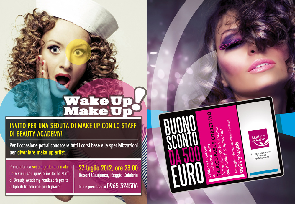 Ph. Simone Pizzi 27/07/2012 - h. 23:00 **Beauty Academy** ***Wake Up, Make Up!*** Vi invita presso il: ****Calajunco Beach Resort**** **Lungomare - Reggio Calabria** Invito per una seduta di Make Up con lo staff di Beauty Academy Info e prenotazioni: **0965.324506**
