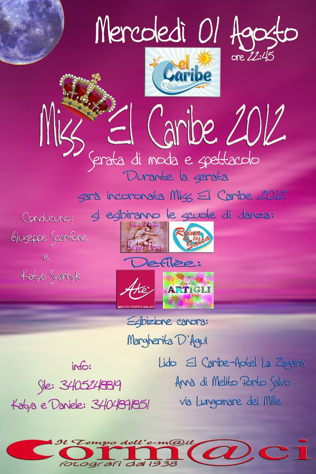 ஜ۩۞۩ஜ[ N Y G H T ★ P A R T Y '012®]ஜ۩۞۩ஜ ◄- - - - - - • P • R • E • S • E • N • T • - - - - - - -► ●●●▬▬▬▬▬▬ஜ۩۞۩ஜ▬▬▬▬▬▬▬▬●●● (¯`’☼╰☆╮☾ MISS★CARIBE ☼╰☆╮☾´¯) ●●●▬▬▬▬▬▬ஜ۩۞۩ஜ▬▬▬▬▬▬▬▬●●● -►Sono aperte le iscrizioni al concorso di bellezza che si terra' Mercoledi 1 Agosto presso il Lido El Caribe...