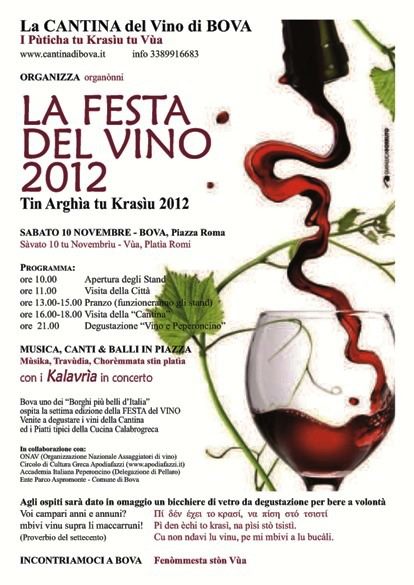 Sabato - 10/11/2012 Foto & Video Alby Occhibelli - Un Omaggio a Questa Bellissima Festa La Cantina del Vino di Bova organizza: La Festa del vino 2012 7ª edizione Bova uno dei “Borghi più Belli d’Italia”ospita la settima edizione della FESTA del VINO Venite a degustare i vini della Cantina ed i Piatti tipici della Cucina Calabrogreca In collaborazione con: ONAV (Organizzazione Nazionale Assaggiatori di vino) Circolo di Cultura Greca Apodiafazzi www.apodiafazzi.it, Accademia Italiana Peperoncino-Delegazione di Pellaro, Ente Parco Aspromonte, Comune di Bova Agli ospiti sarà dato in omaggio un bicchiere di vetro da degustazione per bere a volontà Voi campari anni e annuni? mbivi vinu supra li maccarruni!(Proverbio del settecento) INCONTRIAMOCI A BOVA / Fenòmmesta stòn Vùa 7ª edizione - Bova, Piazza Roma - SABATO 10 NOVEMBRE Programma: