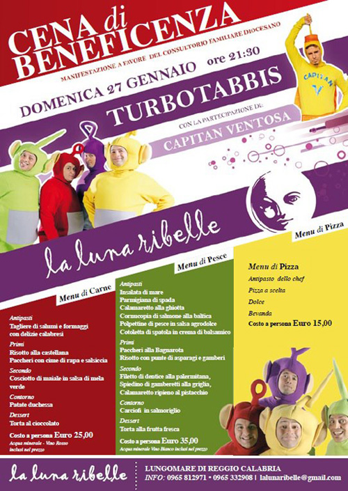 ❤ SOSTIENI CON NOI IL❤ ❤CONSULTORIO FAMILIARE❤ ❤DI REGGIO CALABRIA ❤ **Raccolti 15.000 Euro** **Grazie a Tutti** 27/01/2012 - Luna Ribelle *Turbo Tabbis e Capitan Ventosa* h. 21.30" Spettacolo con Cena di Beneficenza Eventi In Collaborazione con ★"Striscia la Notizia"★, ★"Colorado Caffè"★ e "il Consultorio Familiare della Diocesi di Reggio Calabria"
