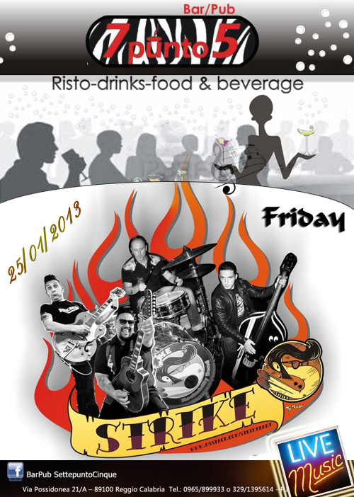 .. è in arrivo un altro Venerdì Night LIVE al tuo affezionatissimo...7.5 Direttamente da Ragusa City... ♪•*•♫✿╰☆ STRIKE ROCKABILLY ☆╮♪•*•♫✿ ...Stuzzicheria open ...Ingresso libero Ex Bar Ferrari, difronte Liceo L. Da Vinci, Reggio Calabria. l Sound degli STRIKE fonda le basi nelle melodie travolgenti del Rockabilly Americano degli anni ’50. La loro strumentazione è rigorosamente "Old Style"... rigorosamente ROCKABILLY... essenziale ma travolgente... "Mr Wolf" voce e chitarra acustica "Roccobilly" Chitarra elettrica Archtop "The Rocker" Contrabbasso Slap "Lo Zar" Batteria Se siete convinti che il loro sia il solito "Rock'n'Roll"... bè vi sbagliate di grosso... ascoltateli nei loro Live... il vostro corpo reagirà da solo! STRIKE... keep on rockin' on the wild side! https://www.facebook.com/StrikeRockabillyBand https://www.facebook.com/StrikeBand