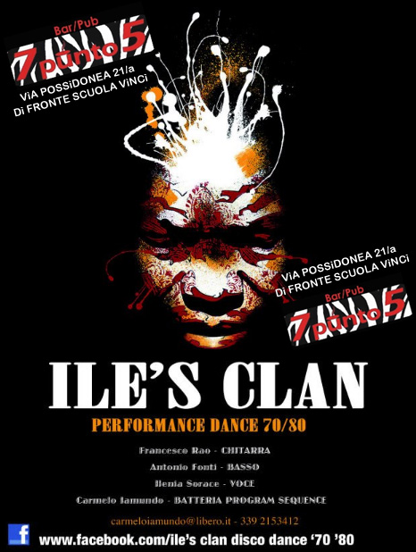 Dal 2010 nasce il progetto Disco dance 70'80', che accontenta tutti i gusti e le richieste dei club e pub, discoteche e piazze cittadine, ed annovera la riproposizione di brani più famosi e caratterizzanti i successi della musica dance e funk. Ad oggi, il gruppo Ile's Clan, viene contattato per lo svolgimento di eventi culturali di ampio respiro artistico, matrimoni, feste private e garantisce la presenza in tutto il territorio nazionale. Membri: Antonio Fonti ( basso ) - Ilenia Surace ( voce ) - Carmelo Iamundo ( batteria e sequencer ) - Francesco Rao ( chitarra ) |