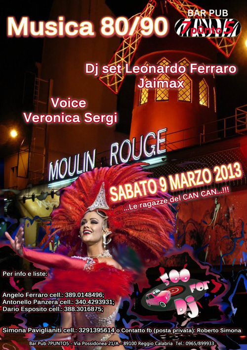 **MoulinRouge** con le ragazze del Can Can .. Musica unica dei nostri anni 80/90, la migliore che ci sia mai stata in circolazione, con: - Dj set Leonardo Ferraro Jaimax - Voice Veronica Sergi Per una serata da non perdere!!!!!! In occasione della serata, potrete degustare uno dei nostri tanti menù, per tutte le esigenze: - Menù Kebab + acqua (8 euro ); - Ricco Aperitivo con Becks o Nastro (10 euro) - Menù Pizza Patatine + bibita ( 15 euro ) oltre al consueto Menù libero Per info e reservations contattare i seguenti numeri: SIMONA PAVIGLIANITI: 329 1395614 ANGELO FERRARO: 389 0148496 DARIO ESPOSITO: 388 3016875 ANTONELLO PANZERA: 340 4293931 |