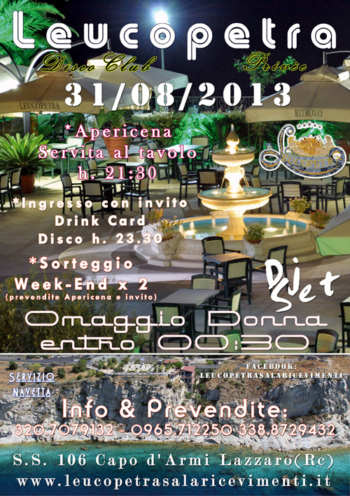 31/08/2013 - Sabato Leucopetra Disco Club sala ricevimenti, ristorante, pizzeria,EventiS.S. 106 Capo d'Armi, Lazzaro(Rc) Sala Ricevimenti Leucopetra "Facebook" ********************************** Evento Facebook: Web site: www.leucopetrasalaricevimenti.it Info: Evento Locandina Ingresso apericena (aperitivo della casa+ drink analcolico) in prevendita ore 21,30 -22,30 servita a tavolo singolarmente