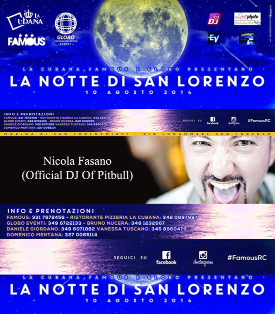 GRANDE EVENTO DELL'ESTATE ••••• "LA NOTTE DELLE STELLE" "LA NOTTE DI SAN LORENZO" SPECIAL GUEST NICOLA FASANO ••••• ★ FREE ENTRY "Nella notte di San Lorenzo gli istanti si fermano tutto diventa possibile e impossibile allo stesso tempo, il potere è in mano ai tuoi desideri. Coltivali, sognali, amali, esprimili nella notte di San Lorenzo" #FamousRC #EsprimiUnDesiderio DJS • Leonardo Ferraro • Jai Max • Erick Violi VOICE • Murizio Valenti • Veronica Sergi • Danieldav23 •••••••••••••••••••• ★ Pizzeria & ristorante ★ Privee ★ Robots Show ★ Girls animation ★ Play of light ★ Mapping ★ Lighting and projection of the sea ★ Fuochi pirotecnici ★ Falò sotto le stelle ★ Animazione