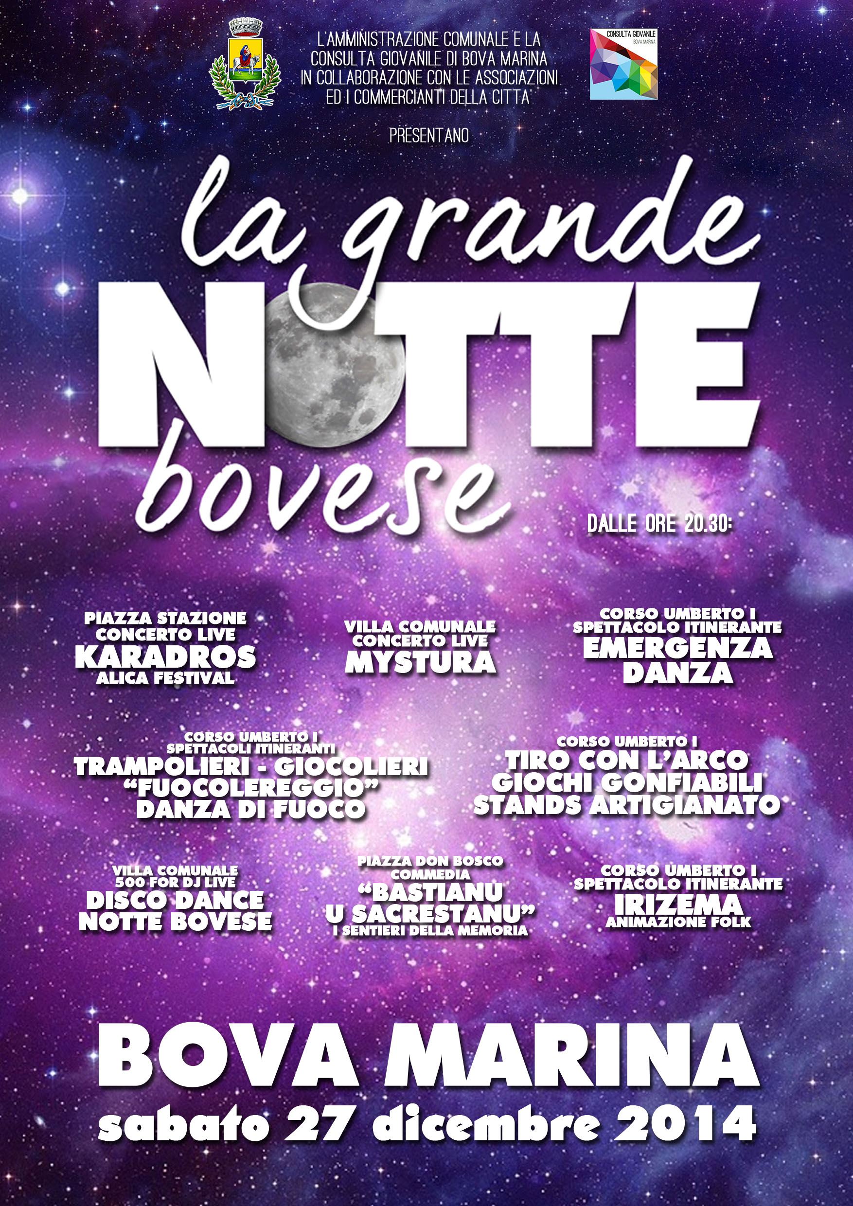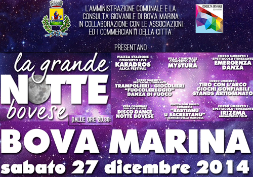 Sabato 27 Dicembre dalle 20:30 L'amministrazione Comunale e la Consulta Giovanile di Bova Marina in Collaborazione con le associazioni ed i commercianti della Città Presentano ★La Grande Notte Bovese★ Bova Marina(Rc) ★-h.20:30 Corso Umberto I - Spettacolo Itinerante EMERGENZA DANA ★-h.20:30 Corso Umberto I - SpettacolI ItinerantI TRAMPOLIERI, GIOCOLIERI, "FUOCOLEREGGIO" DANZA DI FUOCO ★-h.20:30 Corso Umberto I TIRO CON L'ARCO,GIOCHI GONFIABILI,STANDS ARTIGIANATO ★-h.20:30Corso Umberto I - Spettacolo Itinerante IRIZEMA, ANIMAZIONE FOLK ****************