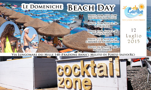 ★BEACH DAY ★ Domenica 12 Luglio sin dai raggi del "Primosole", giochi, animazione in spiaggia e party, tutto nel beach day targato Globo Eventi & EL Caribe.. PROGRAMMA: - DALLE: 10:00 ALLE 12:00 ★BACKGROUND MUSIC - DALLE: 12:00 ALLE 12: 30 ★ ACQUAGYM - DALLE: 15:00 ALLE 15: 30 ★ ACQUAZUMBA - DALLE: 15:30 ALLE 16: 30 ★ CARAIBICI E ANIMAZIONE -DALLE: 16:30 ALLE 18:00 ★ MUSIC DANCE DIVERTIMENTO, INTRATTENIMENTO, ANIMAZIONE & TANTE RISATE...NON MANCARE. Servizi: - Ombrelloni & Sdraio - Camere per la notte - Cocktail Point - Ristorante - Pizzeria - Bar .....e tanto altro ancora..... ◘ ◘ ◘ ◘ ◘ ◘ ◘ ◘ ◘ ◘ ◘ ◘ ◘ ◘ ◘ ◘ ◘ ◘ ◘ ◘ ◘ ◘ ◘ ◘ ◘ ◘ - New LIDO EL CARIBE ZONE Il nuovo lido presenta un aspetto moderno e ben curato, immerso nel verde esotico, e suddiviso in diverse aree denominate "Zone" . Zone: Risto, Pizza, Bar, Relax, Music,Dance, Cocktail e Beach con interni funzionali e innovativi per ogni esigenza e per tutti i clienti. _________________________________________ Lido El Caribe Via Lungomare dei Mille 148 (Frazione Annà) Melito Porto Salvo - RC Info Ombrelloni: 340.5248819